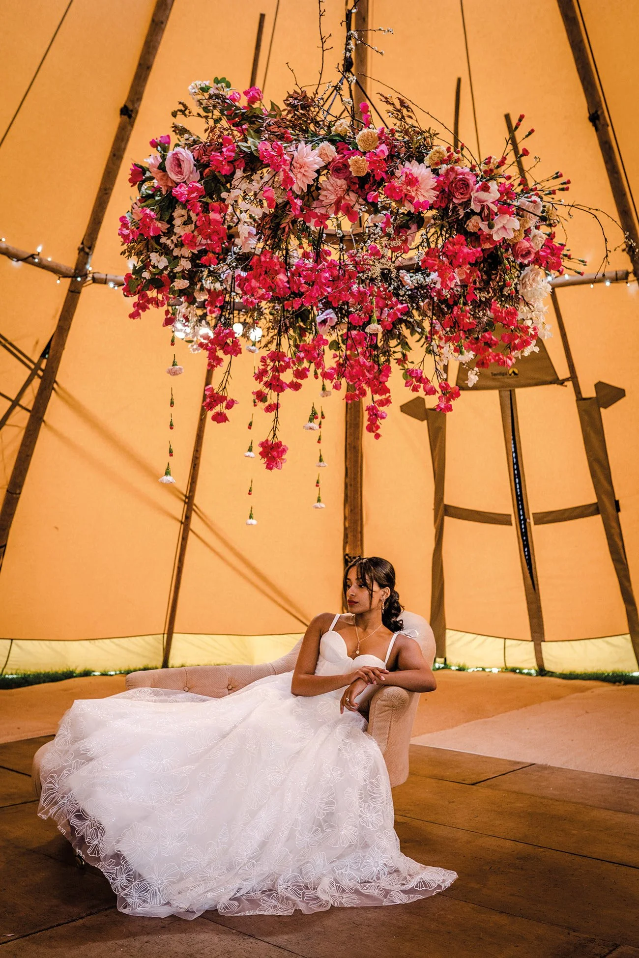 Nikki pairs a neutral palette of oatmeal, beige and camel with pops of bright pink and fuchsia. “Tipis always look amazing with a pop of colour against the canvas,” she says. The florals are key to creating the air of romance and elegance that carries throughout the shoot, and dreamy clusters of blooms in varying shades of pink and fuchsia make a stunning statement in the hanging floral installation – a striking focal point for the ceremony – and along the top table. A beautiful hanging cake with matching floral details completes the glamorous scene.