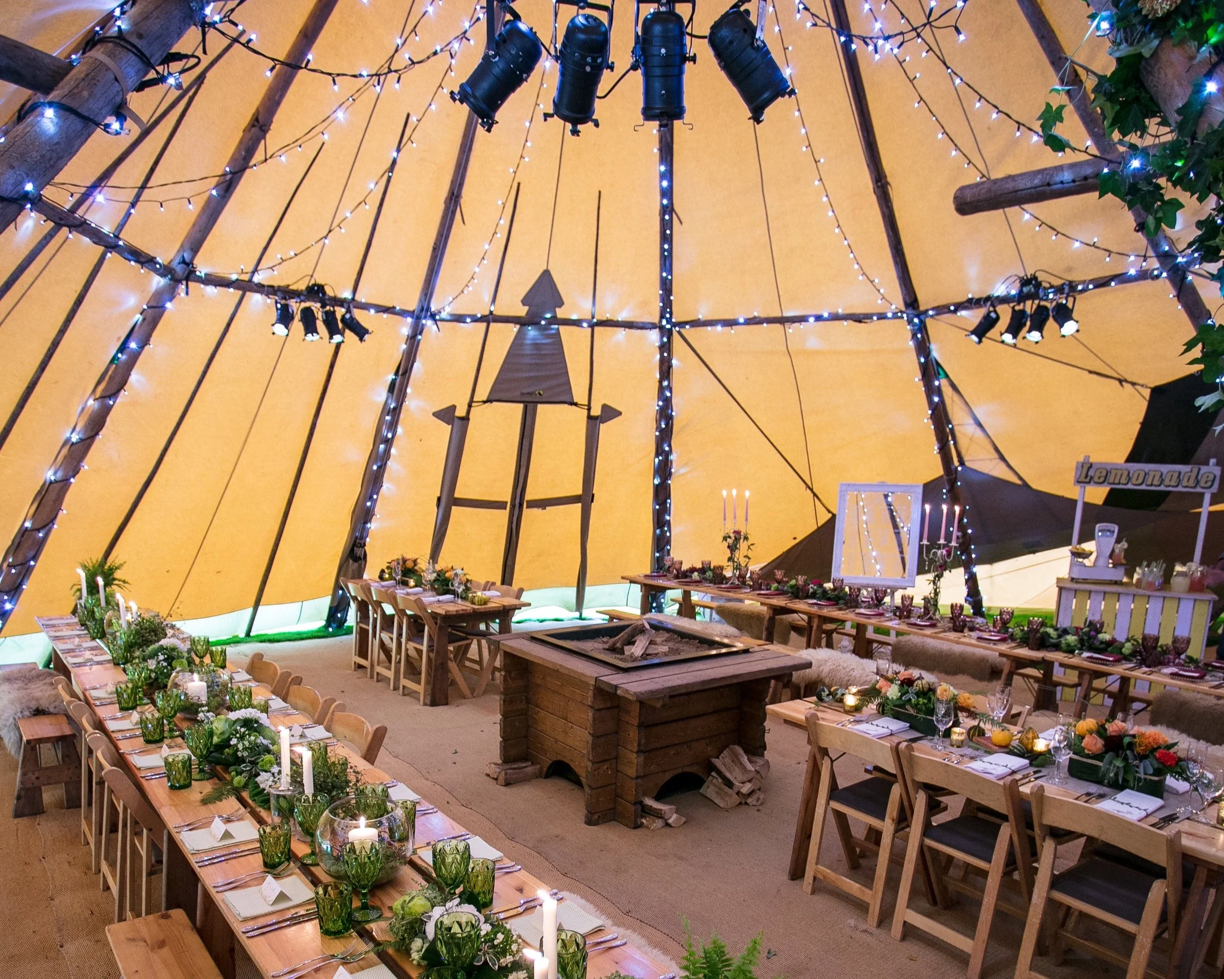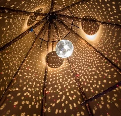 Rotating ball at top of tipi, with multiple spotlights. Ideal for above dance floors.