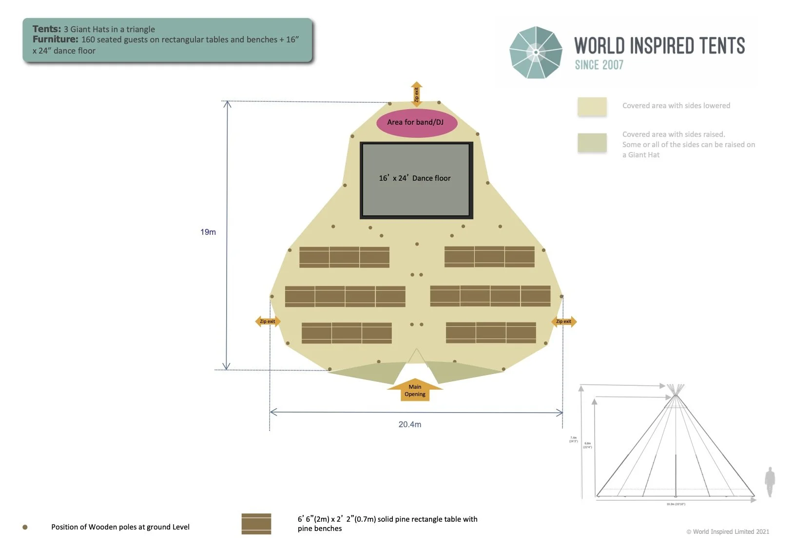 Take a look at our floor plan examples below to see the available space and discover how you can arrange the tipis to fit your event’s needs.