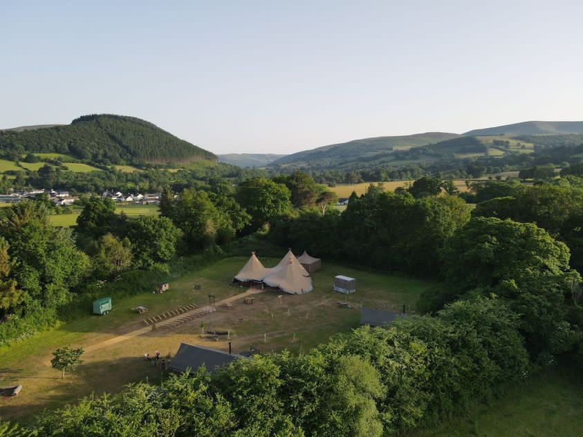 Furnishings: Rectangular pinewood tables with a mix of benches and chairs, bar, dance floor, stage, open fire, fairy lights, outdoor matted walkway and festoon lighting.