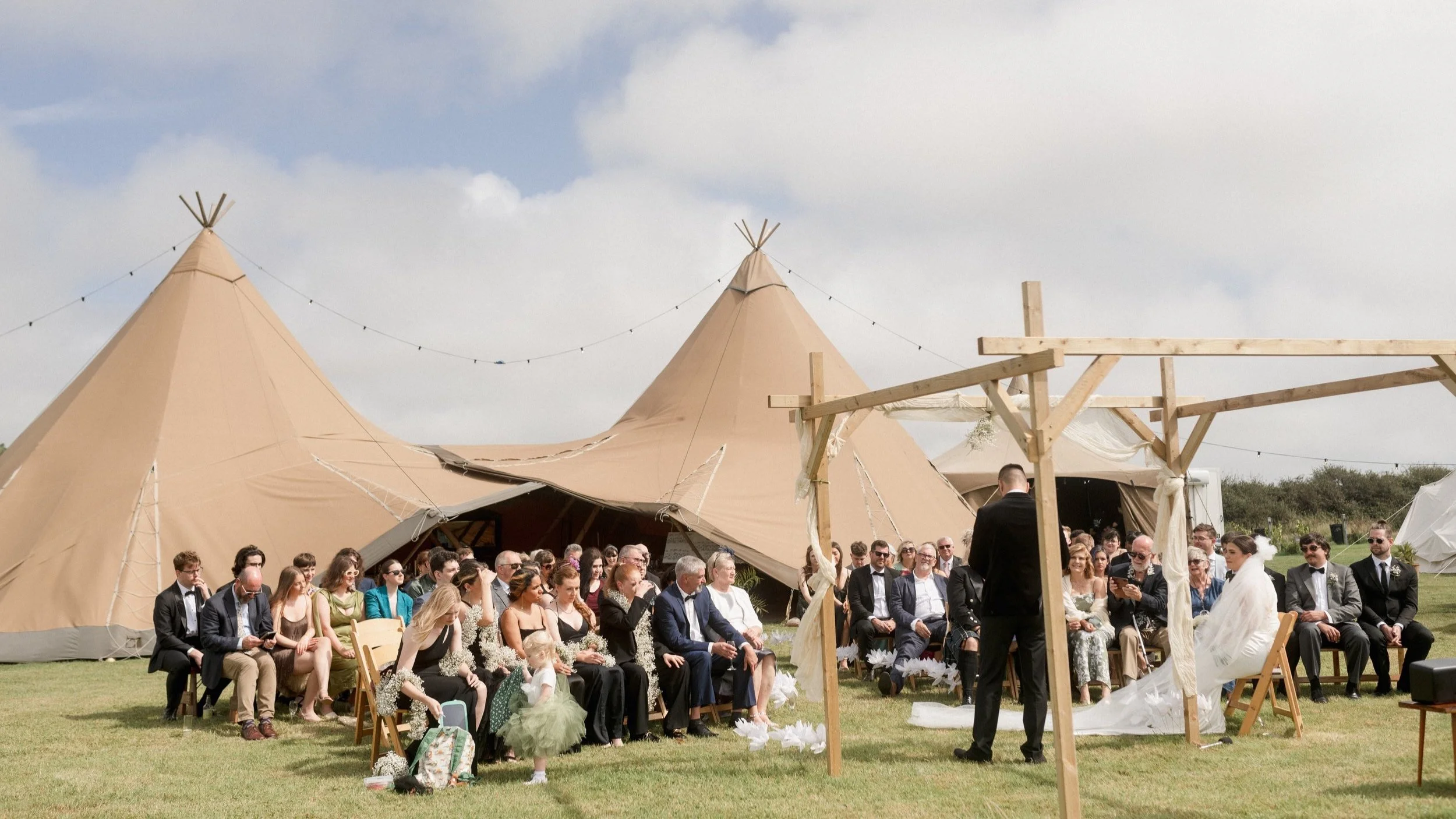 Step into the magic of Ella and Theo’s alfresco-styled wedding, hosted in our stunning tipis! They turned our event tents into a breathtaking setting, complete with twinkling fairy lights, rustic wooden furniture, and elegant decor that set the perfect mood for their big day. Congratulations to Ella and Theo on a truly unforgettable tipi celebration.