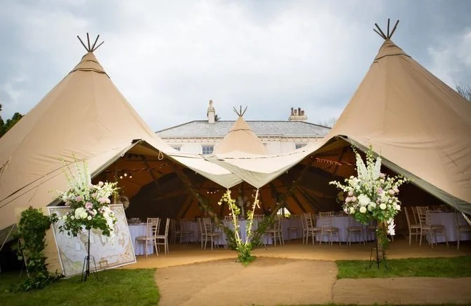 Furnishings: A catering tent, round tables and chivari chairs, chill out furnishings, an open fire, rope and drape fairy lights, a cake table, matting and dimmable lighting.